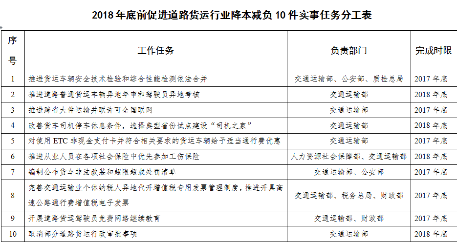 2018年底前,完成降本減負(fù)10件實(shí)事(見附件),推動(dòng)政策落地并取得實(shí)質(zhì)性進(jìn)展。制度性交易成本大幅降低,貨車司機(jī)生產(chǎn)生活條件顯著改善,貨運(yùn)業(yè)戶的獲得感和貨車司機(jī)的歸屬感持續(xù)增強(qiáng),行業(yè)平穩(wěn)發(fā)展的基礎(chǔ)更加牢固。nsT安康新聞網(wǎng)