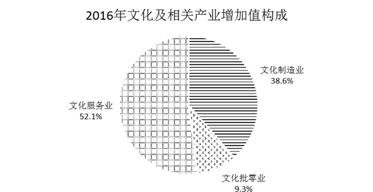 按行業(yè)分,2016年文化制造業(yè)增加值為11889億元,比上年增長7.6%,占文化及相關(guān)產(chǎn)業(yè)增加值的比重為38.6%;文化批發(fā)零售業(yè)增加值為2872億元,增長13.0%,占9.3%;文化服務(wù)業(yè)增加值為16024億元,增長17.5%,占52.1%。ytE安康新聞網(wǎng)