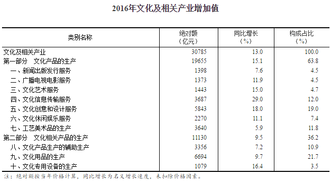 統(tǒng)計(jì)局:2016年文化及相關(guān)產(chǎn)業(yè)增加值同比增13.0%