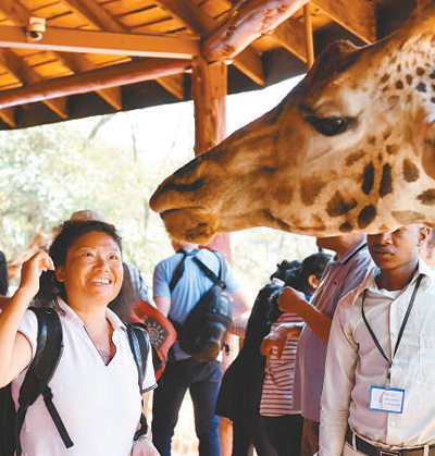 | 近年來,春節(jié)期間前往非洲旅游的中國游客逐漸增多。今年春節(jié)期間,在肯尼亞首都內(nèi)羅畢的長頸鹿中心,一名中國游客和長頸鹿互動(dòng)。 |