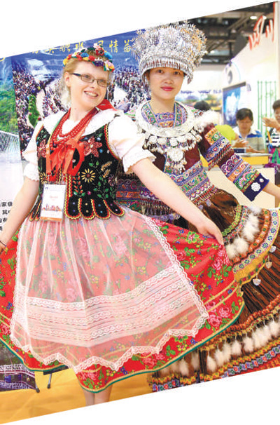 | 在2017北京國際旅游博覽會(huì)上,來自波蘭的安娜(左)和來自廣西柳州市融水苗族自治縣的張鳳媚合影留念。 |