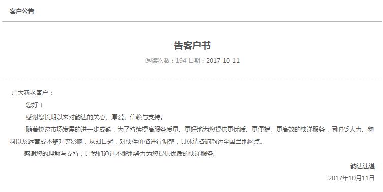 10月11日,韻達(dá)快遞官網(wǎng)發(fā)布《告客戶書》,表示為提供更優(yōu)質(zhì)、更便捷、更高效的快遞服務(wù),同時(shí)受人力、物料以及運(yùn)營成本攀升等影響,從即日起,對(duì)快件價(jià)格進(jìn)行調(diào)整,具體請(qǐng)咨詢韻達(dá)全國當(dāng)?shù)鼐W(wǎng)點(diǎn)。rP4安康新聞網(wǎng)