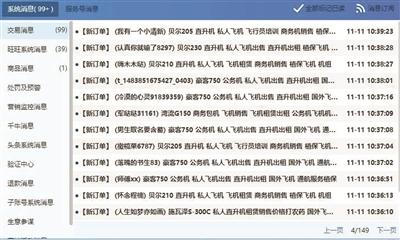 “一開始我還跟他們講,你們就不要問了,直接發(fā)朋友圈吧!”黃平說,“后來實(shí)在回復(fù)不過來,只好設(shè)置了自動回復(fù),‘雙11’大促期間,掌柜已忙瘋!本店所有出售飛機(jī)都是真機(jī),歡迎大家提交訂單轉(zhuǎn)發(fā)朋友圈!”