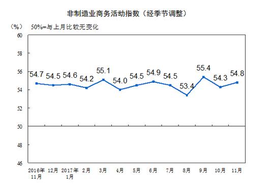 人民網(wǎng)北京11月30日電 據(jù)國(guó)家統(tǒng)計(jì)局網(wǎng)站消息,2017年11月份,中國(guó)非制造業(yè)商務(wù)活動(dòng)指數(shù)為54.8%,比上月上升0.5個(gè)百分點(diǎn),持續(xù)位于擴(kuò)張區(qū)間,非制造業(yè)延續(xù)平穩(wěn)較快的增長(zhǎng)態(tài)勢(shì),增速有所加快。