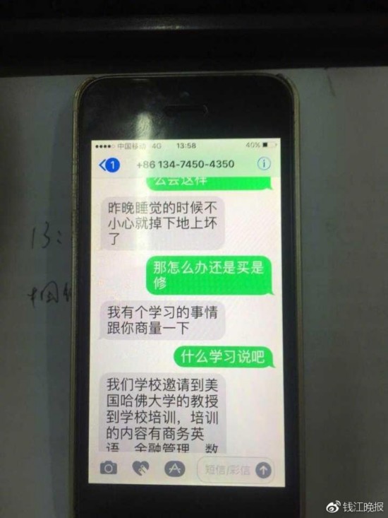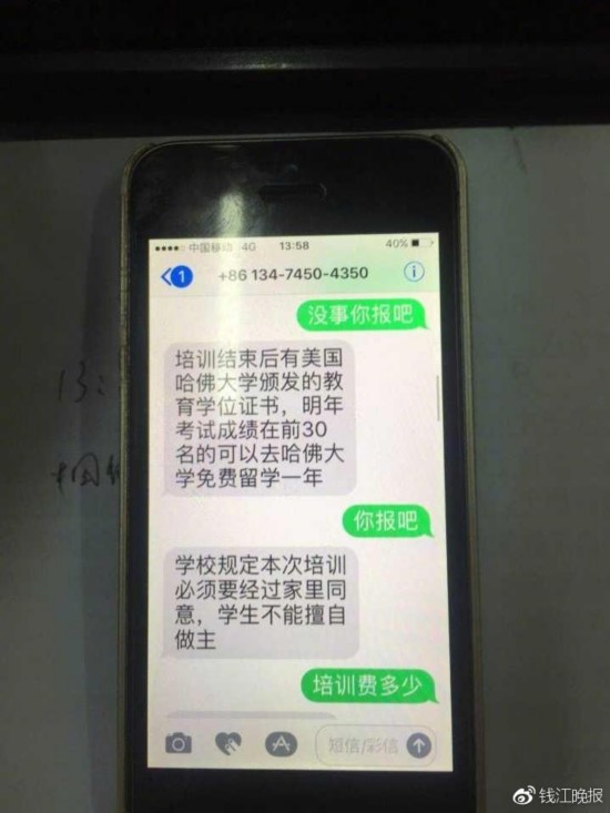 “爸,我是小麗。上午洗衣服手機掉水里開不了機,現(xiàn)在在上課,借了同學(xué)手機,跟你說件十萬火急的事。我們學(xué)校邀請了美國哈佛大學(xué)的資深教授來校面授培訓(xùn),名額有限。一堂課46800,你看我去不去呀?”