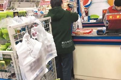 記者在北京市朝陽區(qū)多家超市走訪時(shí)發(fā)現(xiàn),幾乎每家超市在收銀處都掛著型號(hào)不同的塑料袋,這些塑料袋小號(hào)每個(gè)0.2元、大號(hào)每個(gè)0.3元。由于食品選購區(qū)的手撕式食品專用袋基本為免費(fèi)提供,因此幾乎每名顧客的購物籃里都裝著五六個(gè)這樣的塑料袋。