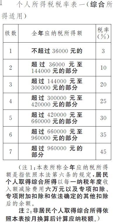 根據(jù)新稅率表,綜合所得應(yīng)該按如下稅率繳稅:全年應(yīng)納稅所得額不超過(guò)36000元的為3%;超過(guò)36000元至144000元的部分為10%;超過(guò)144000元至300000元的部分為20%;超過(guò)300000元至420000元的部分為25%;超過(guò)420000元至660000元的部分為30%;超過(guò)660000元至960000元的部分為35%;超過(guò)960000元的部分為45%。