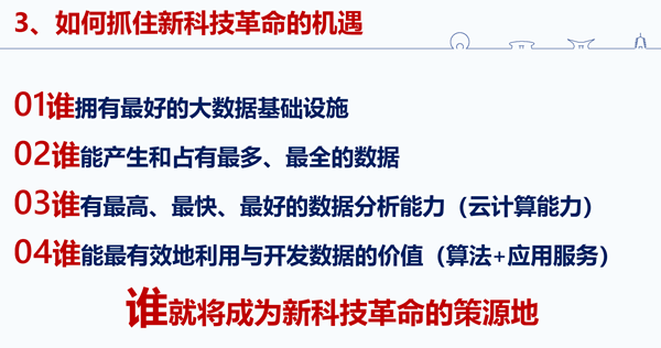 這一次新的科技革命,誰成為它的策源地,誰就會成為科技強國,這個也是十九大習近平總書記給我們提出的要求,到2050年中國要成為科技強國。要想成為科技策源地主要的競爭將會在四個層面展開:第一,誰擁有最好的大數(shù)據(jù)基礎設施;第二,誰能產(chǎn)生和占有最多、最全的數(shù)據(jù);第三,誰有最高、最快、最好的數(shù)據(jù)分析能力;第四,誰能最有效地利用與開發(fā)數(shù)據(jù)的價值,假如在這四個層面我們?nèi)梢灶I先世界,我們就是新的科技革命的策源地。
