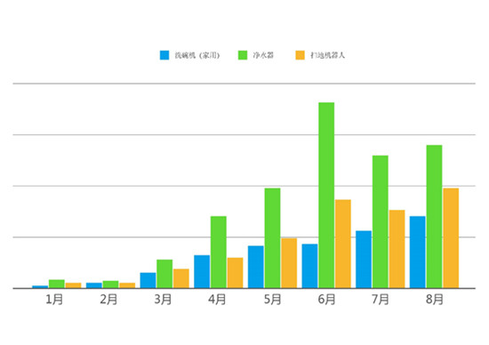 數(shù)據(jù)顯示,相較于1月,8月份凈水器在全國零售云店的銷量增長1390%,洗碗機(jī)增長1300%,掃地機(jī)器人增長573%,吸塵器增長490%,單反相機(jī)增長400%。