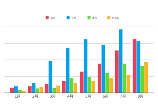 同樣的情況也出現(xiàn)在其他品類的銷售上。數(shù)據(jù)顯示,8月旺季5000元以上的空調(diào)高端機(jī)銷量比1月增長了874%。值得注意的是,中央空調(diào)銷量增長1867%,縣鎮(zhèn)市場對于更為節(jié)能環(huán)保、節(jié)省空間、衛(wèi)生健康的中央空調(diào)越來越感興趣。