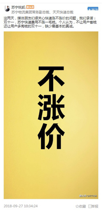 面對快遞公司的紛紛漲價,不少剁手黨們擔(dān)心,最后的成本都會出在自己身上。針對這一熱點話題,9月27日,蘇寧物流常務(wù)副總裁姚凱通過微頭條發(fā)聲,承諾這個雙十一,蘇寧快遞費(fèi)用不漲一毛錢!他認(rèn)為,不為用戶省錢還讓用戶多掏錢的雙十一,缺少最基本的真誠。