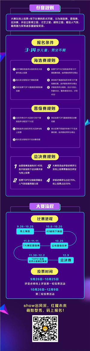 每個孩子都有一個舞臺的夢想,每個孩子的夢想都值得被尊重。無論是一首小小的兒歌,還是一段簡單的舞蹈,抑或一場自信的走秀,都是孩子們極具天賦的才藝。如果你是一位尊重孩子天性發(fā)展的家長,如果你希望TA能在國際舞臺上一展風(fēng)采,那么,別猶豫,舞臺已就位,敢show敢紅,C位星萌娃未來可期!