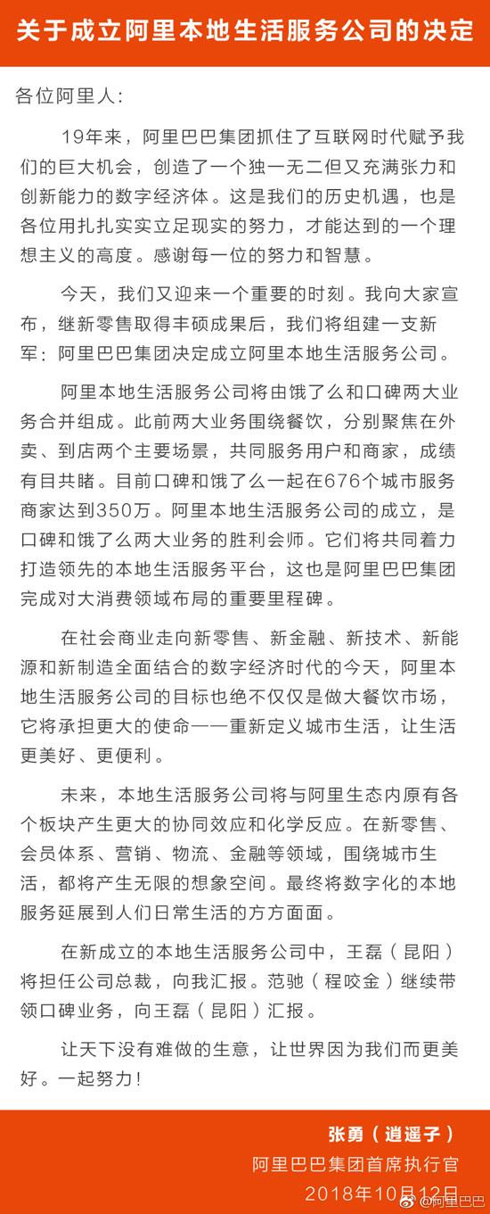 據(jù)悉,阿里巴巴集團(tuán)合伙人王磊(花名昆陽(yáng))將擔(dān)任阿里本地生活服務(wù)公司總裁,向阿里集團(tuán)CEO張勇匯報(bào),并兼任餓了么CEO;阿里巴巴集團(tuán)副總裁范馳(花名程咬金)將繼續(xù)帶領(lǐng)口碑業(yè)務(wù),向王磊匯報(bào)。M36安康新聞網(wǎng)