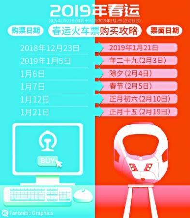 2019年鐵路春運(yùn)從1月21日起至3月1日止,共40天,節(jié)前15天,節(jié)后25天。全國(guó)鐵路預(yù)計(jì)發(fā)送旅客41330萬(wàn)人次,同比增加3176萬(wàn)人次,增長(zhǎng)8.3%,日均發(fā)送1033萬(wàn)人次,再創(chuàng)歷年春運(yùn)新高。鐵路春運(yùn)火車(chē)票互聯(lián)網(wǎng)和電話(huà)訂票提前30天發(fā)售,2018年12月23日,可以購(gòu)買(mǎi)春運(yùn)第一天(2019年1月21日)的火車(chē)票,2019年1月6日可訂除夕當(dāng)天車(chē)票。