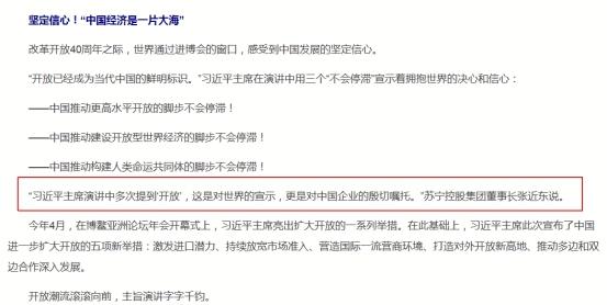 在聆聽(tīng)主旨演講后,蘇寧當(dāng)家人張近東感慨:“隨著中國(guó)改革開(kāi)放進(jìn)程的不斷深化,蘇寧在海外市場(chǎng)的合作效率會(huì)越來(lái)越高、合作規(guī)模會(huì)越來(lái)越大!SGu安康新聞網(wǎng)