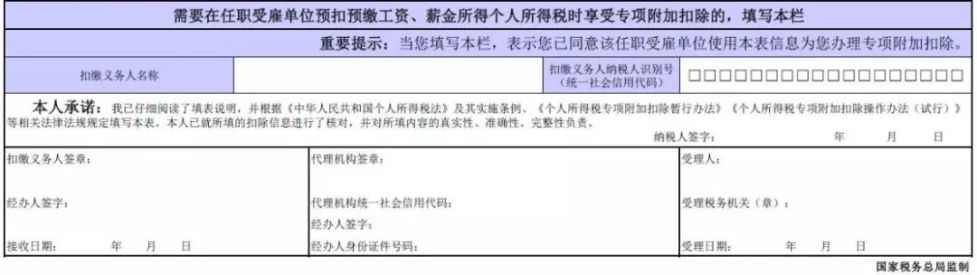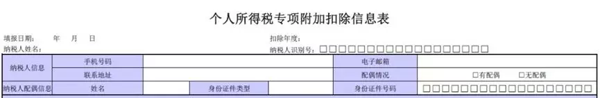 根據(jù)從網(wǎng)上下載的表格來看,在表頭項目中需要填寫填報日期,扣除年度等信息。其中,納稅人識別號是指身份證號碼,如果沒有身份證號碼的需填寫稅務(wù)機關(guān)賦予的納稅人識別號。