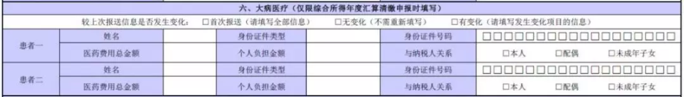 大病醫(yī)療一欄中,“醫(yī)藥費用總金額”需填寫社會醫(yī)療保險管理信息系統(tǒng)記錄的與基本醫(yī)保相關(guān)的醫(yī)藥費用總金額;個人負(fù)擔(dān)金額需填寫社會醫(yī)療保險管理信息系統(tǒng)記錄的基本醫(yī)保目錄范圍內(nèi)扣除醫(yī)保報銷后的個人自付部分。