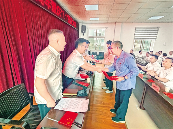 6月26日上午,嵐皋縣城關鎮(zhèn)西坡社區(qū)黨組織為黨齡滿50年的3名老黨員頒發(fā)“光榮在黨50年”紀念章,給每名參會黨員送上“政治生日賀卡”。魏代續(xù) 廖霖 攝i2e安康新聞網(wǎng)