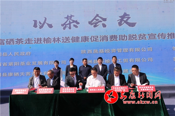 活動(dòng)儀式上,國家一級(jí)茶葉審評(píng)技師、陜西省茶人聯(lián)誼會(huì)會(huì)長韓星海對(duì)安康紫陽富硒茶作專業(yè)點(diǎn)評(píng),紫陽縣有關(guān)部門負(fù)責(zé)人作紫陽招商推介、紫陽富硒茶推介、紫陽旅游推介;顒(dòng)進(jìn)行了簽約、紫陽富硒茶專家點(diǎn)評(píng)和“紫陽富硒特產(chǎn)營銷中心”授牌儀式。紫陽縣人民政府與陜西晟基投資管理有限公司簽訂富硒礦泉水綜合開發(fā)項(xiàng)目;陜西省紫陽茶業(yè)發(fā)展有限公司與子洲縣蘇榆農(nóng)工貿(mào)有限公司簽訂“紫陽富硒茶、子州”養(yǎng)生茶項(xiàng)目合作開發(fā)協(xié)議;紫陽縣康硒天茗茶業(yè)有限公司與榆林市高新區(qū)惟藏商行簽訂紫陽富硒茶購銷協(xié)議;紫陽縣供銷聯(lián)社與陜西煤山煤海有限公司簽訂共建“榆林市紫陽富硒特產(chǎn)營銷中心”協(xié)議,紫陽縣供銷聯(lián)社與榆陽區(qū)供銷聯(lián)社簽訂“地方特產(chǎn)供銷互促合作協(xié)議”。