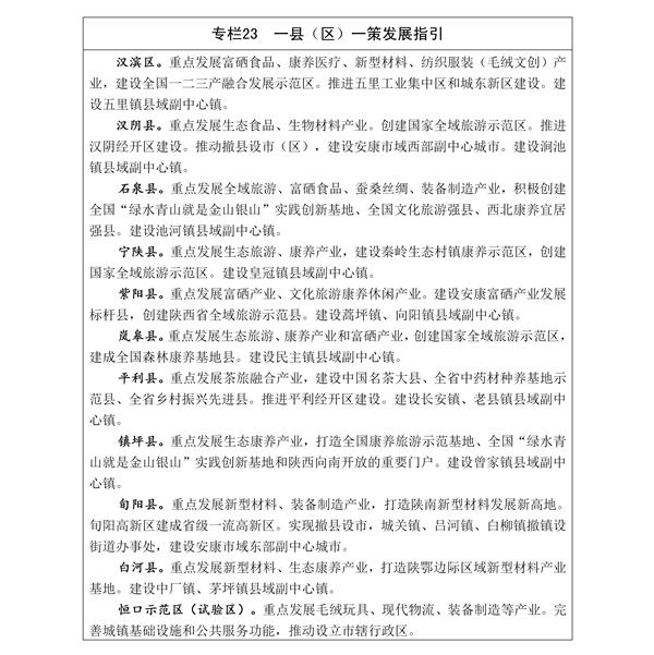 構(gòu)建“一核、兩心、兩帶、多點”新型城鎮(zhèn)化格局。一核:以中心城市為核心,推動瀛湖生態(tài)旅游區(qū)、恒口示范區(qū)(試驗區(qū))融入中心城市發(fā)展。兩心:推進(jìn)漢陰、旬陽市域副中心城市建設(shè)。兩帶:月河川道城鎮(zhèn)帶,統(tǒng)籌中心城市—恒口—漢陰—石泉協(xié)同發(fā)展,建設(shè)城鄉(xiāng)統(tǒng)籌示范區(qū)、新型工業(yè)聚集區(qū)、綠色發(fā)展引領(lǐng)區(qū)。漢江生態(tài)城鎮(zhèn)帶,以漢濱、石泉、旬陽為核心,漢陰、紫陽、嵐皋、白河為節(jié)點,輻射帶動其他區(qū)域,打造三產(chǎn)融合發(fā)展的漢江生態(tài)城鎮(zhèn)帶。多點:以其他縣城、重點鎮(zhèn)、縣域工業(yè)集中區(qū)、現(xiàn)代農(nóng)業(yè)園區(qū)和旅游景區(qū)為節(jié)點,打造縣域經(jīng)濟(jì)增長極。