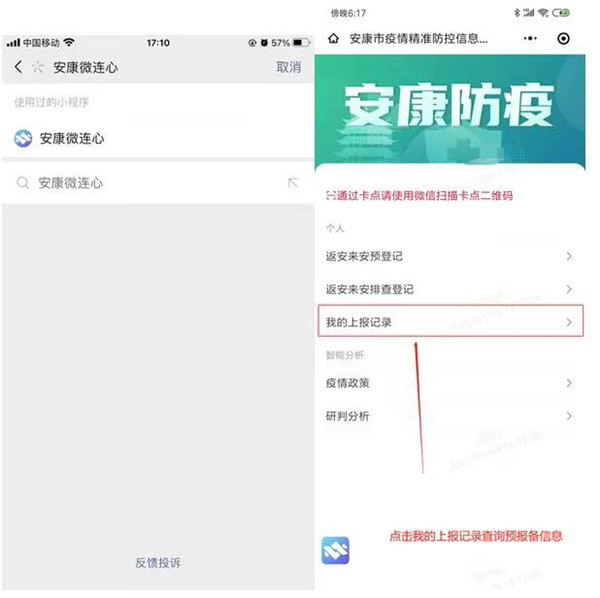 第三步,通過交通卡口,打開“安康微連心”微信小程序,點(diǎn)擊“安康防疫”,進(jìn)入“我的上報(bào)記錄”,點(diǎn)擊“查看詳情”,點(diǎn)擊“我已抵達(dá)” 并掃描交通卡口“返安排查登記二維碼”確認(rèn)抵達(dá)。