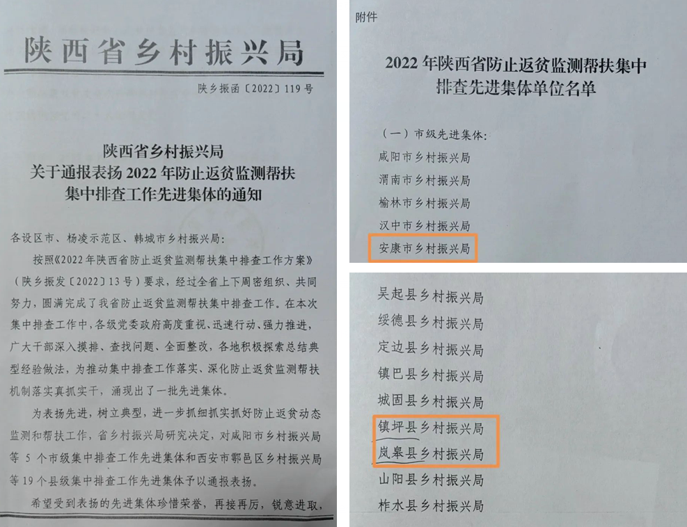 在8月5日陜西省鄉(xiāng)村振興局《關(guān)于通報(bào)表揚(yáng)2022年防止返貧監(jiān)測(cè)幫扶集中排查工作先進(jìn)集體的通知》中,我市鄉(xiāng)村振興局和嵐皋、鎮(zhèn)坪鄉(xiāng)村振興局獲得先進(jìn)集體的通報(bào)表揚(yáng)。