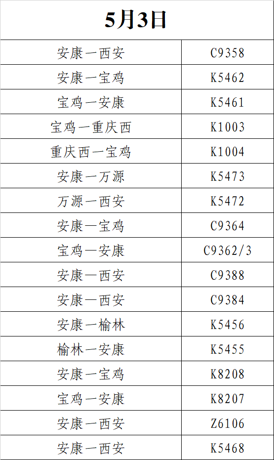 為滿足旅客返程需求,5月3日安康火車站共加開旅客列車21列。主要集中在西安、寶雞、榆林、重慶、萬源等方向。