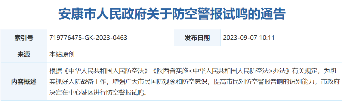 根據(jù)《中華人民共和國人民防空法》《陜西省實施<中華人民共和國人民防空法>辦法》有關規(guī)定,為切實抓好人防戰(zhàn)備工作,增強廣大市民國防觀念和防空意識,提高市民對防空警報音響的識別能力,市政府決定在中心城區(qū)進行防空警報試鳴,F(xiàn)將有關事項通告如下: