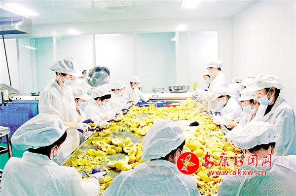 中廠鎮(zhèn)石梯社區(qū)木瓜產(chǎn)業(yè)園區(qū)里工人們?yōu)槟竟先テ。王?攝