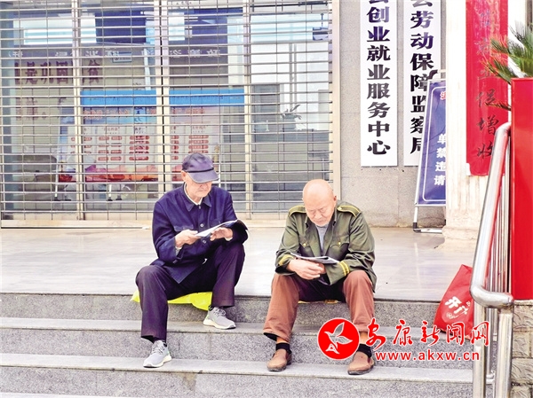 4月20日,在白河縣人社局門前,兩位老大爺各自捧著雜志閱讀。張陽敏 攝