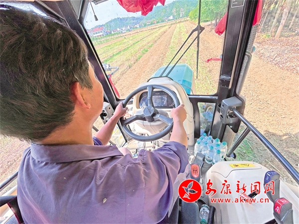 圖二:胡洪申駕駛拖拉機(jī)耕犁土地,為播種做好準(zhǔn)備工作。
