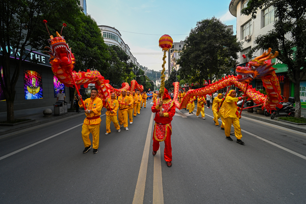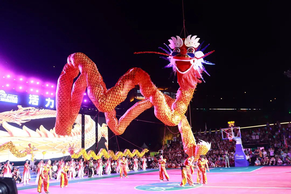 開幕式規(guī)模宏大,異常精彩。貴州廣播電視臺知名節(jié)目主持人、貴州村BA節(jié)目主持人李旭涵、劉子豪兩位重量級主持人親臨主持,熟練專業(yè)而又激情的引導(dǎo)互動(dòng)為開幕式晚會(huì)增添爆棚氛圍。歌手沙寶亮傾情演唱《最初的信仰》《又回首》《暗香》等歌曲,世界散打冠軍、國家散打隊(duì)主教練許家恒,全國競走冠軍陳珍、全國青運(yùn)會(huì)冠軍田紫丹的互動(dòng)以及本土節(jié)目《旗開得勝》《歡迎你到嵐皋來》《巴山魔芋情》等將嵐皋豐厚的旅游資源、特色產(chǎn)品、人文風(fēng)情展現(xiàn)得淋漓盡致。無比酷炫的燈光秀、煙花秀閃耀全場,56米巨龍騰空而起,光與影的交織變換構(gòu)成了一幅幅絕妙畫卷,現(xiàn)場掌聲雷動(dòng),喝彩聲、吶喊聲此起彼伏。