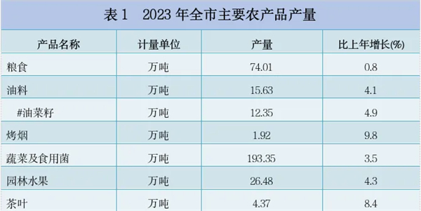 2023年,全市農(nóng)林牧漁業(yè)增加值增長(zhǎng)3.9%。其中,農(nóng)業(yè)增加值增長(zhǎng)4.2%;林業(yè)增加值增長(zhǎng)2.4%;牧業(yè)增加值增長(zhǎng)2.2%;漁業(yè)增加值增長(zhǎng)8.3%;農(nóng)林牧漁專業(yè)及輔助性活動(dòng)增加值增長(zhǎng)6.4%。