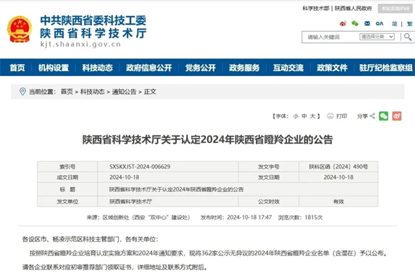 10月18日,陜西省科學(xué)技術(shù)廳公布了2024年度陜西省瞪羚企業(yè)名單,經(jīng)過層層篩選和嚴(yán)格評(píng)審,安康大數(shù)據(jù)公司成功入選“陜西省瞪羚企業(yè)”榜單。