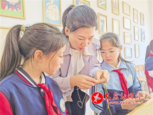 倉上鎮(zhèn)中心小學(xué)編織社團(tuán)老師在教授編織技巧ef9安康新聞網(wǎng)