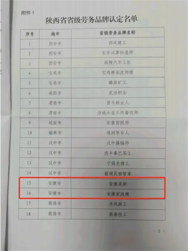 12月3日,陜西省人力資源和社會(huì)保障廳、陜西省財(cái)政廳公布2024年陜西省省級(jí)勞務(wù)品牌認(rèn)定名單及2024年陜西省省級(jí)勞務(wù)品牌引領(lǐng)單位認(rèn)定名單,我市兩個(gè)勞務(wù)品牌——安康美廚、安康家政嫂,兩家勞務(wù)品牌引領(lǐng)單位——陜西禹金洲餐飲管理有限公司、陜西康嫂家政服務(wù)有限公司分別入選。
