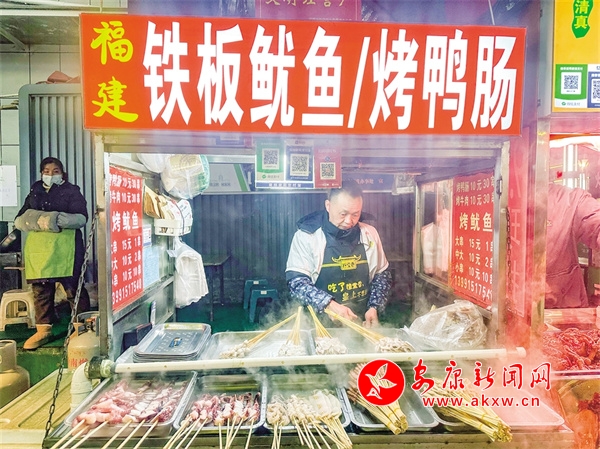 對(duì)此,在距離不遠(yuǎn)的金州路雙堤巷擺攤多年的福建人嚴(yán)國強(qiáng)有著更深的感觸。“我來安康有20多年了,主要賣烤魷魚,租個(gè)鋪?zhàn)硬粍澦悖瓦@種小車又方便成本也低。最開始我在市中心廣場附近擺攤,那時(shí)候流動(dòng)性比較大,顧客也不太放心在我們這種小攤上消費(fèi)。這幾年政府倡導(dǎo)‘夜經(jīng)濟(jì)’,我就干脆搬過來了,今年給我們統(tǒng)一辦理了營業(yè)執(zhí)照、食品攤販登記備案卡,顧客一看這些證件,消費(fèi)起來更安心不說,對(duì)我們也是一種保障,能夠固定在一個(gè)地方長久地將生意做下去,水電這些也不用自己再想辦法解決,我很知足了。”