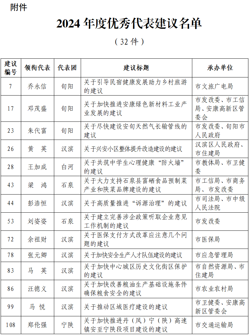 市五屆人大五次會議以來,全體市人大代表緊緊圍繞全市中心工作和人民群眾普遍關(guān)心關(guān)注的熱點難點問題,依法履行職責(zé),積極建言獻策,共提出了256件代表建議,這些建議主題明確具體、建議切實可行、行文簡潔規(guī)范、效果可期可見,為推進我市經(jīng)濟社會發(fā)展和民主法治建設(shè)凝聚了智慧、增進了共識、貢獻了力量。為樹立典型、推進工作,市人大常委會決定,對喬永信等代表提出的32件優(yōu)秀代表建議予以通報表揚。