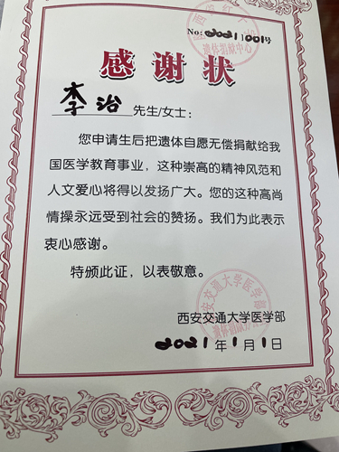 15年來,李治還積極資助困難學(xué)生、為災(zāi)區(qū)捐資捐物,為他人、為社會(huì)付出了很多,但他總覺得不夠。2021年,他自愿申請(qǐng)并成功登記為遺體捐獻(xiàn)志愿者。“這是我那年送給自己的新年禮物。”他指著西安交通大學(xué)醫(yī)學(xué)部的感謝狀說。