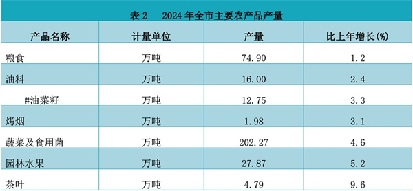 2024年,全市農林牧漁業(yè)增加值增長3.2%。其中,農業(yè)增加值增長4.5%;林業(yè)增加值增長7.6%;牧業(yè)增加值下降2.3%;漁業(yè)增加值增長7.0%;農、林、牧、漁專業(yè)及輔助性活動增加值增長5.6%。