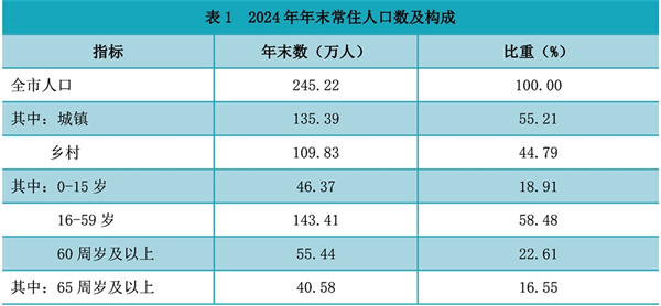 2024年末,全市常住人口245.22萬人,比上年末減少0.5萬人。其中,城鎮(zhèn)人口135.39萬人,城鎮(zhèn)化率達到55.21%;鄉(xiāng)村人口109.83萬人,占44.79%。出生人口1.69萬人,出生率為6.89‰;死亡人口2.02萬人,死亡率為8.24‰;自然增長率為-1.35‰。