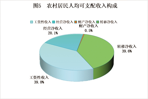 全市農村居民人均可支配收入15434元,比上年增加1031元,增長7.2%。其中,工資性收入6149元,增長7.1%,占可支配收入的比重為39.8%;經營凈收入3104元,增長6.0%,占比20.1%;財產凈收入77元,增長12.5%,占比0.5%;轉移凈收入6104元,增長7.8%,占比39.6%。