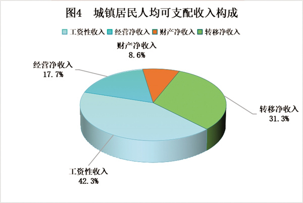 全市城鎮(zhèn)居民人均可支配收入35313元,比上年增加1674元,增長5.0%。其中,工資性收入14954元,增長5.5%,占可支配收入的比重為42.3%;經營凈收入6264元,增長4.5%,占比17.7%;財產凈收入3028元,增長4.1%,占比8.6%;轉移凈收入11067元,增長4.9%,占比31.3%。