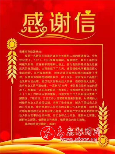 從感謝信中獲知:家住漢濱區(qū)建民辦長(zhǎng)春村二組的尤大爺年近八旬,因7月11—12日強(qiáng)降雨導(dǎo)致附近一棵幾十年的大樹(shù)被風(fēng)刮倒,壓在他家院墻和山墻上,更為危險(xiǎn)的還危及近在咫尺的高壓線(xiàn)路。供電部門(mén)對(duì)高壓線(xiàn)路的樹(shù)枝做了清理,但因倒塌大樹(shù)粗壯,樹(shù)干太長(zhǎng),沒(méi)有專(zhuān)業(yè)工具處理,仍存在較大安全隱患。老大爺突然想到曾在路邊看到市政人員對(duì)行道樹(shù)進(jìn)行修剪,于是抱著試試的心態(tài)撥打了安康市市政園林處電話(huà)。接到求助后,該處綠化管護(hù)科當(dāng)天下午派了2名專(zhuān)業(yè)人員趕往現(xiàn)場(chǎng),對(duì)該樹(shù)干進(jìn)行分段切割移除,解決了困擾老大爺?shù)男念^大患。老大爺對(duì)市政園林處及時(shí)高效辦理群眾煩心事、操心事非常感激,連夜寫(xiě)信并通過(guò)快遞形式寄到市政園林處。一封感謝信只是市政園林處踐行開(kāi)展黨史學(xué)習(xí)教育“我為群眾辦實(shí)事”主題實(shí)踐活動(dòng)的一個(gè)縮影。自黨史學(xué)習(xí)教育以來(lái),市政園林處以學(xué)踐用,以學(xué)促干,累計(jì)為群眾辦實(shí)事11件,扎實(shí)推進(jìn)市政園林項(xiàng)目建設(shè),社區(qū)群眾自發(fā)送來(lái)錦旗2面,各級(jí)媒體爭(zhēng)相報(bào)道。tq6安康新聞網(wǎng)