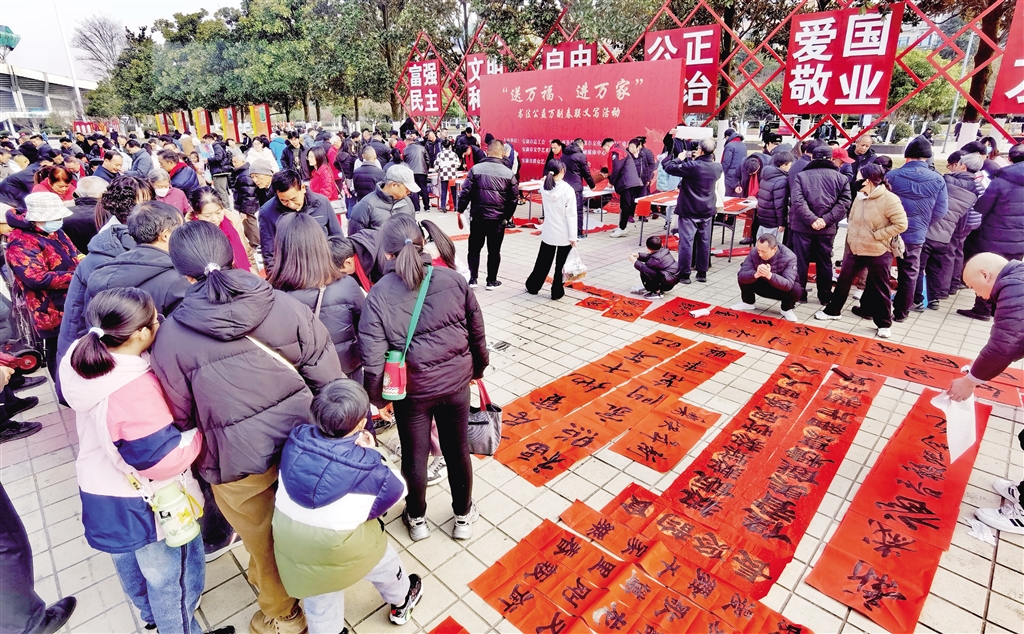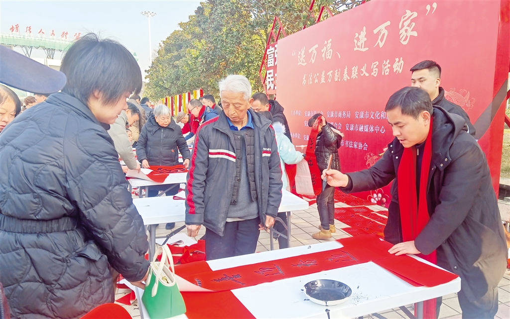 活動(dòng)現(xiàn)場(chǎng),人頭攢動(dòng),長(zhǎng)桌一字?jǐn)[開,書法家們精神飽滿,手中的毛筆飽蘸濃墨,筆鋒游走間,楷、行、隸、草等多種書體各顯神韻,一副副滿載祝福的春聯(lián)、一張張承載希望的“福”字躍然紙上,飽含著濃濃年味兒,寄托著人們對(duì)新年的美好憧憬與希望。前來領(lǐng)取春聯(lián)的市民絡(luò)繹不絕,大家一邊欣賞書法創(chuàng)作,一邊挑選著心儀的春聯(lián)內(nèi)容,現(xiàn)場(chǎng)氣氛熱烈融洽。活動(dòng)還將在安康高新區(qū)、西城坊、部分旅游景點(diǎn)等地持續(xù)進(jìn)行。(記者 陸青波 攝)45Z安康新聞網(wǎng)