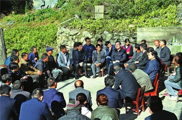 (10月10日,省委書記胡和平深入嵐皋縣南宮山鎮(zhèn)西河村,與部分群眾及鎮(zhèn)村干部進行座談,了解扶貧工作進展,聽取群眾意見建議,與大家一起商討脫貧致富的措施。陜西日報記者 宋紅梅/攝)