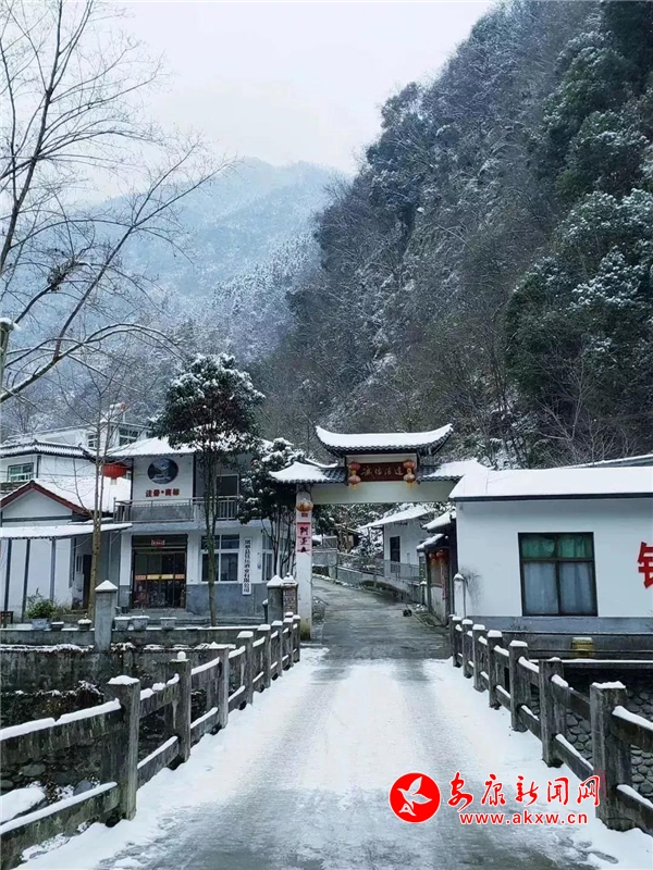 愈往深山走去,愈是銀裝素裹。發(fā)如雪,天作襯。色彩在這里失去了顏色,整個世界只剩下黑與白的構圖。山澗中露出的黑巖,連綿著,將青絲的線條起伏蜿蜒地勾勒而出。山腳下一排排整齊的村民安置房,已顯出冬眠酣睡的樣子。樹林里帶著一層朦朧,在群山連綿中起伏著,為這雪天獻上了一幅絕美的水墨畫卷,也更增加了幾分神秘。
