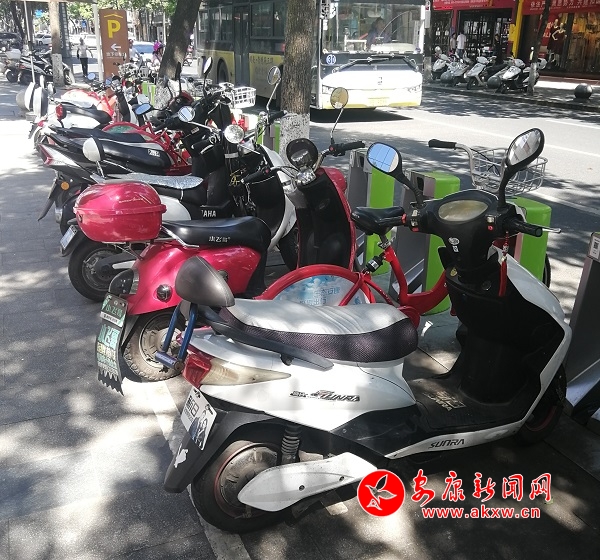 本網(wǎng)訊(記者 牟慶紅)7月31日,記者在興安中路一商城門(mén)前發(fā)現(xiàn),大量摩托車(chē)、電動(dòng)車(chē)扎堆停放在城市公共自行車(chē)樁旁,使得公共自行車(chē)無(wú)法停靠。