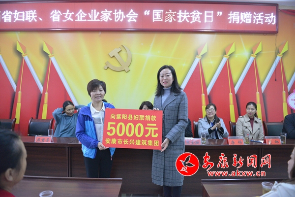 捐贈(zèng)活動(dòng)中,省女企業(yè)家協(xié)會(huì)輪值會(huì)長(zhǎng)、楊陵本真社區(qū)公益基金會(huì)發(fā)起人燕君芳作為代表向紫陽(yáng)縣婦聯(lián)捐贈(zèng)扶貧資金20萬(wàn)元,用于為貧困婦女購(gòu)買(mǎi)健康保險(xiǎn)、困難婦女兒童救助等。同時(shí),表示將與紫陽(yáng)建立穩(wěn)定的幫扶關(guān)系,在物資和技術(shù)上對(duì)紫陽(yáng)脫貧工作給予支持。安康市長(zhǎng)興建筑集團(tuán)公司向紫陽(yáng)縣婦聯(lián)捐贈(zèng)扶貧資金5000元,用于縣婦聯(lián)包聯(lián)村愛(ài)心超市運(yùn)營(yíng)。