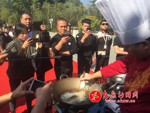 瀛湖酒店魚宴大師現(xiàn)場展示魚宴菜品和廚藝。幾十米長的長桌魚宴,豐富多彩的魚宴菜品,百名游客一邊品吃、一邊拍照,一邊點評菜品,現(xiàn)場熱鬧非凡,游客對長桌魚宴的形式以及菜品贊不絕口。
